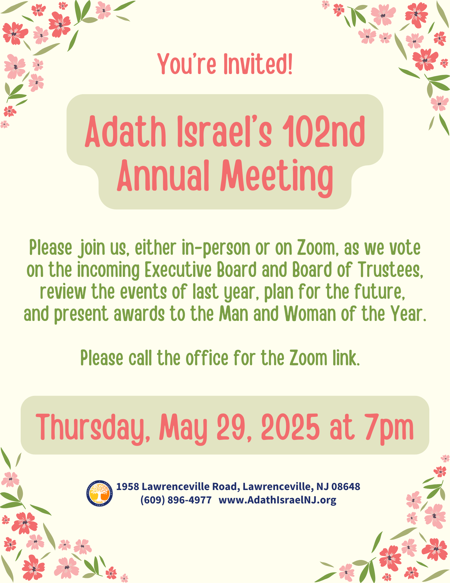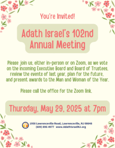 Unless specified otherwise, all events are organized by Adath Israel Admin Phone: 609-896-4977.